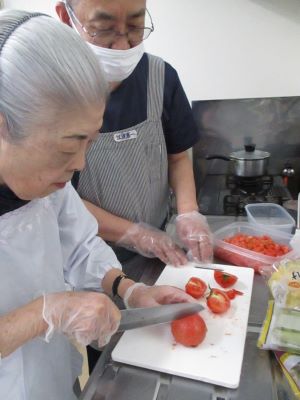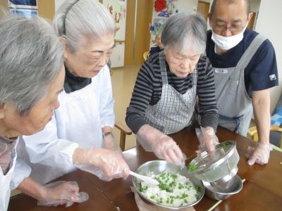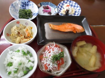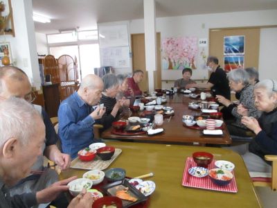 トマトの好きな方が「ご飯がトマトでもいい」と笑わせてくれたことから今日のメニューになりました。①豆ごはんと一緒に、②シラスとトマトの漬け丼の仲良しご飯。③おみそ汁にはスタッフが採ってきたわらびや蕗など山菜がたっぷり入っています。他には④ますの塩焼き⑤筍と豚肉炒め⑥春菊のごま和え⑦しば漬け⑧チョコバナナです。いつもは1人から3人程で食べていますが今日は大家族のように賑やかな昼食で、いつの間にかお皿もきれいになっていました。