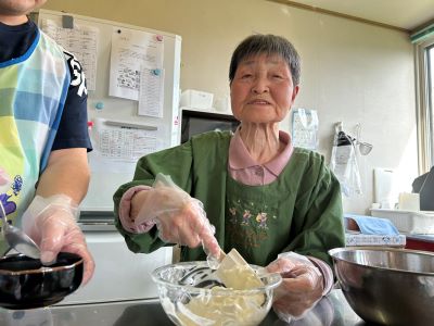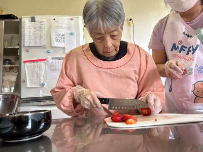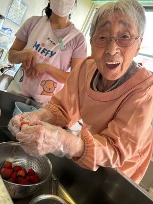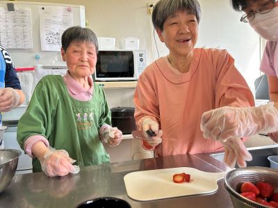 皆さんで、レアチーズケーキ作りをしました。クリームチーズに砂糖やゼラチン、生クリームを入れて、イチゴを切って飾ります。飾りつけが完成したら、いざ冷蔵庫へ。冷やして固めれば、次は実食です。明日の出来上がりが楽しみです。
