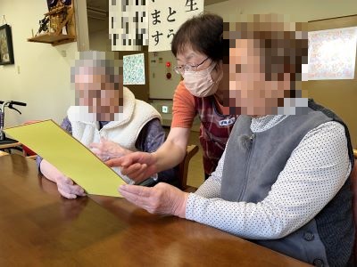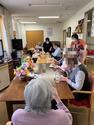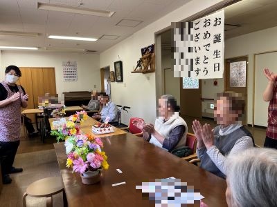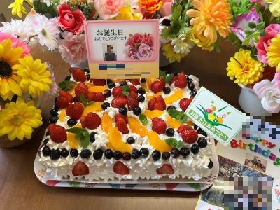 こぎくのA様が87歳のお誕生日を迎えました。A様は先月27日に入居されたばかりの方です。全員で『ハッピーバースディトゥユー』を歌い、職員から写真とメッセージ入りの色紙をプレゼントされると大きな声で「ありがとうございます。とっても嬉しいです」とお礼を言ってくださいました。職員手作りのフルーツたっぷりのケーキでお祝いしました。フルーツケーキに中庭のミントを彩で飾ったところ、入居者様方に爽やかな香りがすると好評でした。