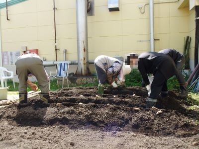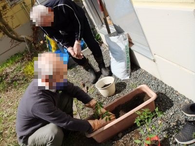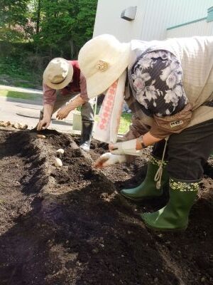 お天気の良い日、早く大きな実をつけるよう祈りながら野菜の苗、ジャガイモやサツマイモの種芋を植えました。皆さん、慣れた手つきで手際よく植えて行きました。今から収穫が楽しみです。