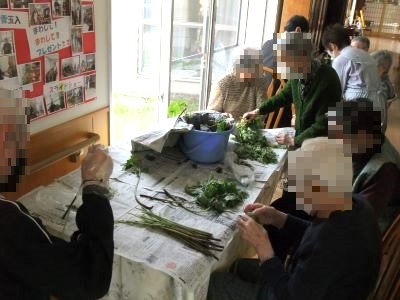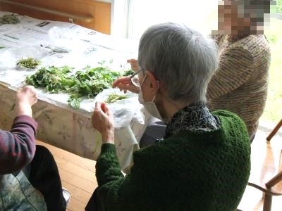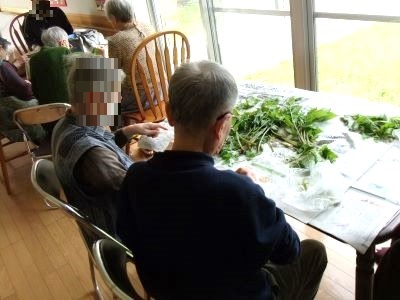 入居者様の家族様から差し入れていただいた山菜(ミズとわらび)を皮むきし、他の具材と合わせて調理をする体験デーを行いました。この日の昼食・夕食に提供された皆様合作の山菜料理は格別のおいしさだったようです。自然の恵みと、差し入れて下さった家族様に感謝です。