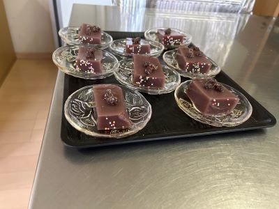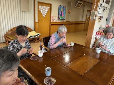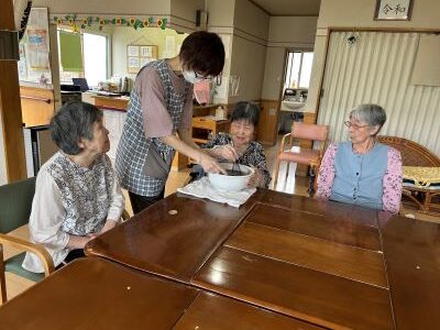 和風おやつ作りに挑戦!と言う事で、水羊羹を作りました。寒天を沸騰するまで煮て、かき混ぜてから餡子を入れ、更にかき混ぜます。よく混ざったら甘納豆を入れて、洗った牛乳パックに投入。それを冷蔵庫で冷やして、固まれば完成です。清涼感と控えめな甘さで、後味もさっぱり。「また作って下さいね。」とリクエストされました。