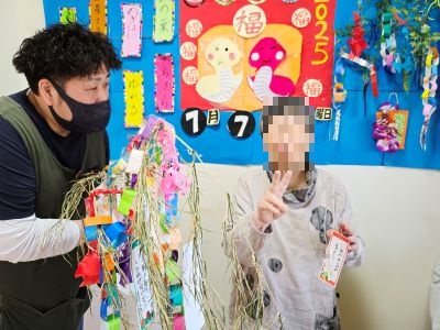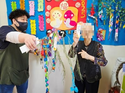もうすぐ七夕です。入居者様と職員とで短冊飾りに願い事を書いて笹に飾りました。入居者様方は、ご家族と自身の健康を願ったり、GH諏訪沢で元気で楽しく過ごせるように等、それぞれ思い思いに書いておられました。