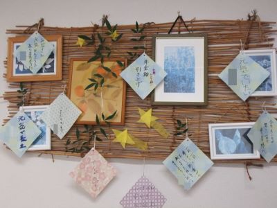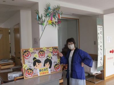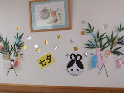 七夕レクリエーションで入居者様と短冊を作りました。飾りつけもバッチリで、素敵な七夕の準備が整いました。その後は皆様で七夕にちなんだ星形の具材をのせたカップ麺をおやつとして食べました。