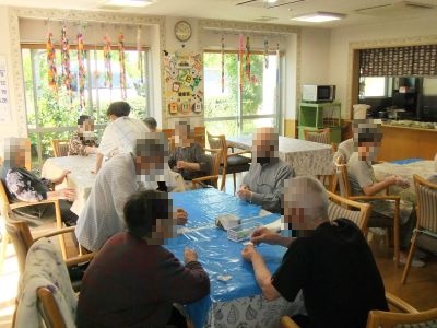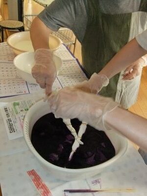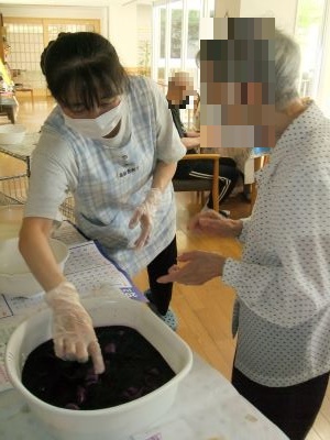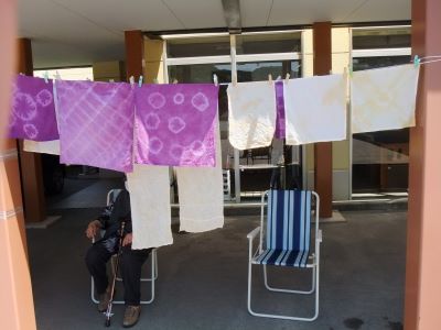 7/13日昨年使用した染料の他、給食から廃棄される玉ねぎの皮を譲り受け、染物体験をしました。どのような模様になるかを楽しみにしながら様々な道具を使って模様付けをしました。玉ねぎの染料は優しいクリーム色に染まり、ガーゼのスヌード完成に歓声が上がり、互いに染物の出来栄えを鑑賞し、「また、やりたい」と次の体験を楽しみにされていました。