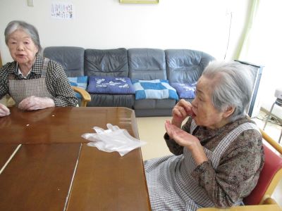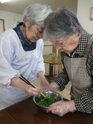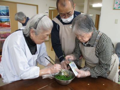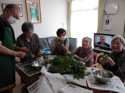 スタッフがミズを収穫してきました。早速下ごしらえを始めるお母さん達。丁寧に皮をむき、茹でて塩昆布で味付け。「一回味見して」「ん~もう少し塩気ほしいな」という事で塩昆布を足して完成です。馴染ませて明日の昼食会でいただきます