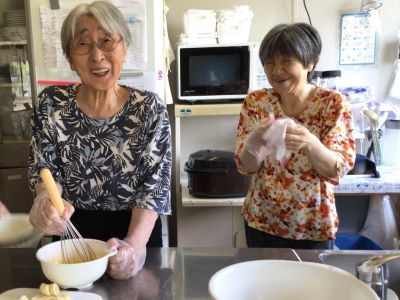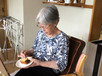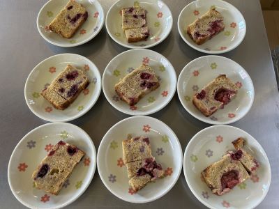 入居者様と一緒に、おやつで食べようとパウンドケーキを作りました。皆さんで役割分担をして、バナナとベリーの甘酸っぱいパウンドケーキの出来上がりです。ユーモアを交えながら、おしゃべりも楽しく、笑いが絶えませんでした。簡単にできるのでまた作りましょう。今度は、何を入れましょうね。