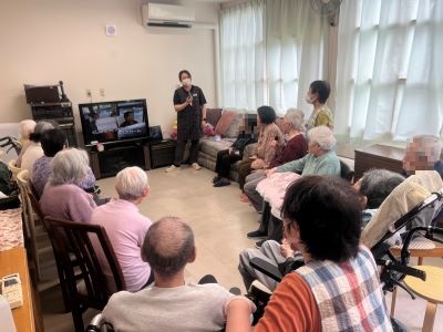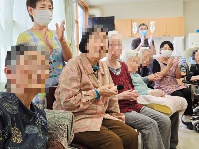 今日は、皆様大好きなカラオケdayです。感染症予防対策(換気、手指、マイクの消毒)をしながら入居者様方に楽しく元気に歌っていただきました。皆様それぞれ、『東京のバスガール』『瀬戸の花嫁』等、お好きな曲を選び、元気に歌って親睦を深めておられました。シャイなA様が、「私、歌好きだけど下手だから迷惑かける」と呟くと、B様が、「そったこと関係ないよ。歌いへ」とA様にマイクを手渡し、嬉しそうに歌うA様の姿と盛り上げるB様や他入居者様方の姿が印象的でした。