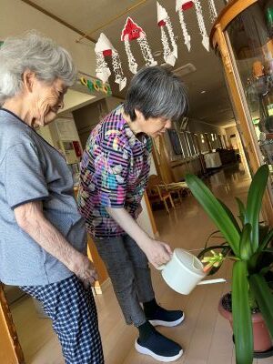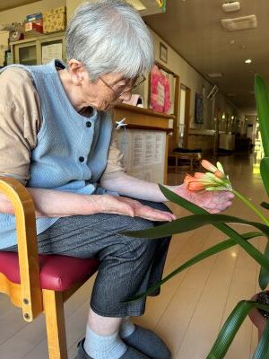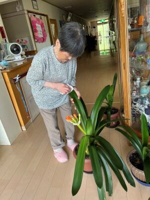 星遊荘にずっといて、もう花は咲くことは無いのかなぁ。と思っていた君子蘭の芽が出て、花が綺麗に咲きました。皆様で毎日葉っぱを布できれいにして大事に育ててきた甲斐がありました。入居者様の気持が君子蘭に届いたのですね。「毎日のお手入れありがとうございました。」君子蘭に成り代わり、御礼申し上げます。