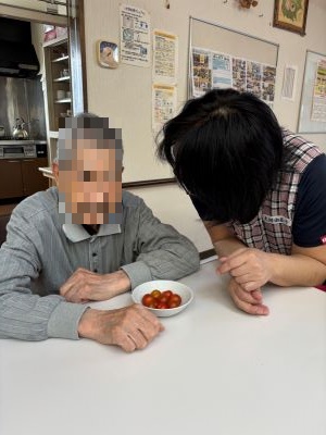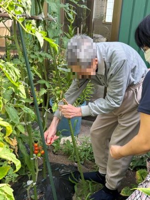 中庭に植えたミニトマトを収穫しました。連日の暑さのため少し涼しい朝8時からの収穫です。赤いトマトを自分で選んでいただき、「美味しい」と笑顔です。
