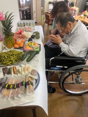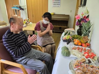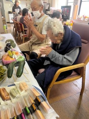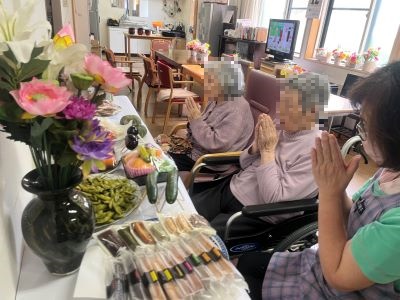入居者様方と職員とで精霊馬と精霊牛を作り、季節の野菜や果物、お菓子をお供えして精霊棚を設置しました。ご先祖様の霊を祀り、感謝を伝え、皆様、手を合わせておられました。
