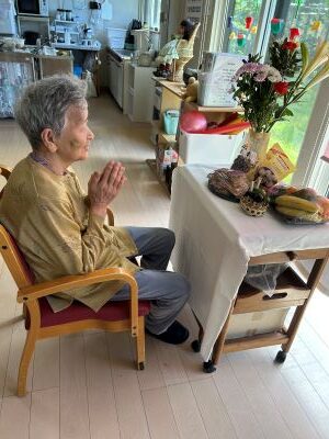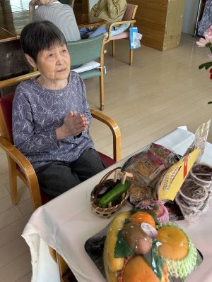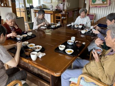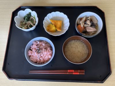 ご先祖様の供養と、皆様と家族様の健康をお祈りいたしました。昼食は、職員手作りの赤飯と煮しめ、ほうれん草のお浸し、カボチャ煮でした。「赤飯は甘くて美味しい。」と好評でした。