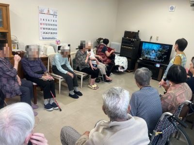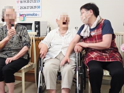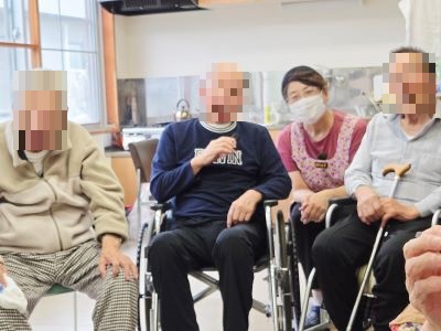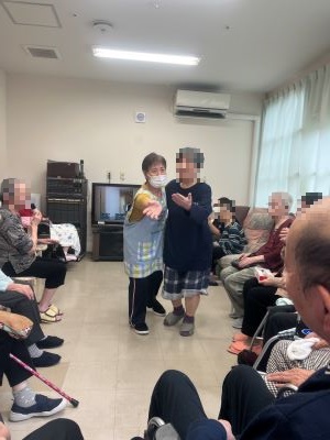 今月も感染症予防対策(換気、手指、マイクの消毒)をしながら入居者様方に楽しく元気に歌っていただきました。皆様それぞれ、『リンゴの唄』『長崎の鐘』『青い山脈』『せんせい』『愛の水中花』『ブルー・ライト・ヨコハマ』『東京のバスガール』『22歳の別れ』等、お好きな曲を選び、思い思いに歌ったり、ダンスに興じ楽しんでおられました。A様が、「選ぶ曲で年齢、わかるっきゃあ」と笑うと、B様が、「かぐや姫の22歳の別れは俺の青春時代の歌だ」と話され盛り上がっていました。