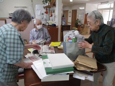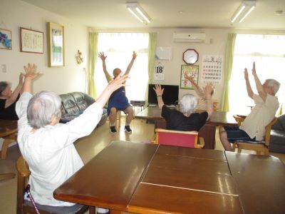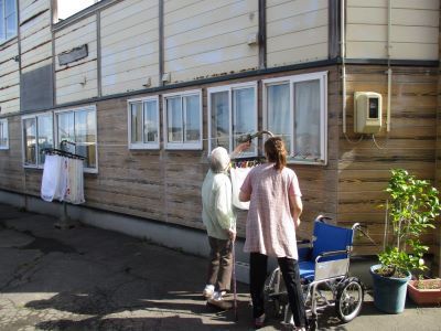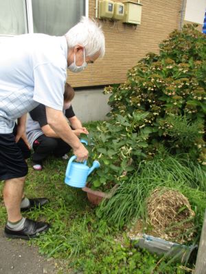 「今日は天気がいいから洗濯物が乾くよ」と洗ったタオルなどをハンガーに止めて外に出してくれます。入居者様が自分たちでかけられるようにと、高さやロープを工夫してスタッフが設置してくれました。「枝豆にも水をやらないと」そう言って枝豆に一番に水をやり、トマトや茗荷にも水をかけてくれます。「もう少しで食べられるな」と野菜を作っていた方は野菜の事を教えてくれる朝の日課です。おやつ前の体操、今日は資源ゴミの日。皆で役割を持って暮らしています。