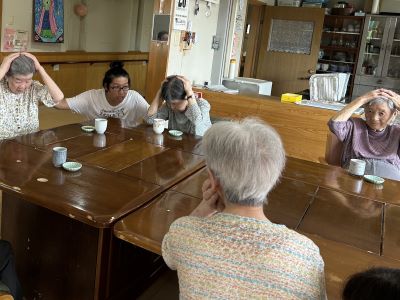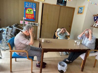 地震想定での避難訓練を実施しました。おやつの時に地震発生、入居者様皆さん手で頭を防いでいます。揺れが収まり安全な廊下へと避難しました。災害がおきても安全に避難できるよう訓練を行っています。