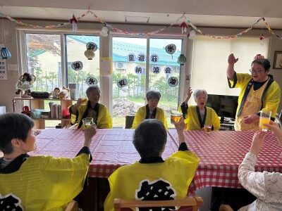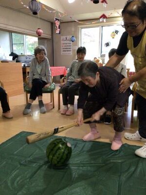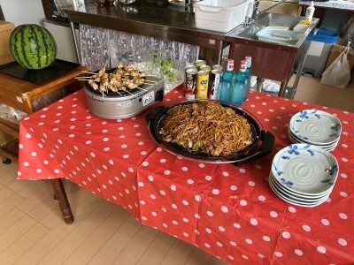 星遊荘納涼会を開催しました。まずは、ノンアルコールビールやジュースで乾杯。鉄板で焼いた焼きそばや焼き鳥を食べました。そのあとには、カラオケタイムで盛り上がり、スイカ割りをしました。なかなか割れずに大苦戦!でも今年の暑さを吹っ飛ばしました。まだまだ暑い日が続きますが、皆さん健康で夏を乗り切りましょう。