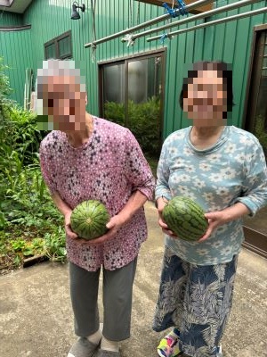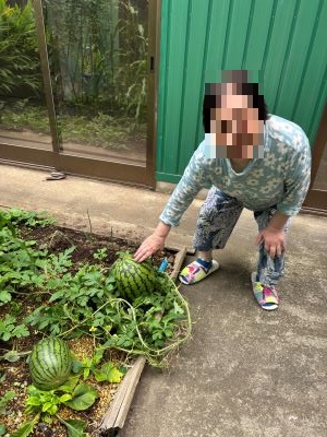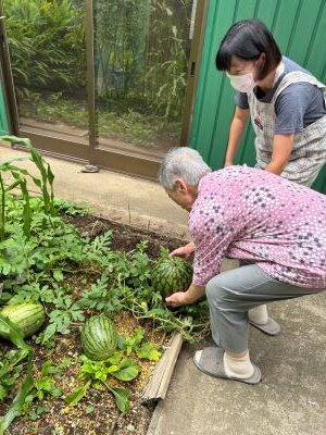 宮田館の中庭の畑よりトウモロコシと西瓜を収穫しました。夏の日差しをたくさん浴びて大きく育った西瓜に大喜びです。冷やして、おやつにしましょう!