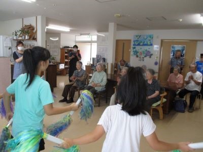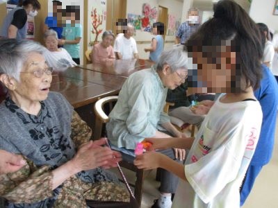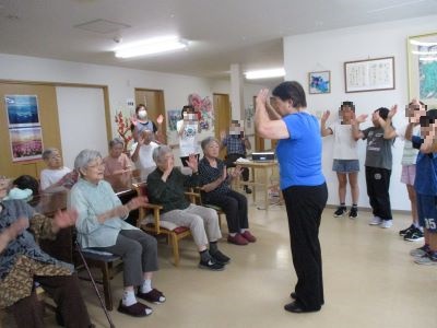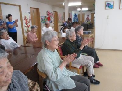 今日は、皆様待ちに待った野内児童館の子供たちが慰問に来てくれました。皆で歌や踊りを見せてくれて、笑顔が絶えません。ひ孫を見るように優しい笑顔になる皆様を見て職員も嬉しくなりました。