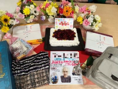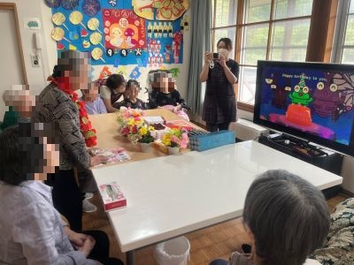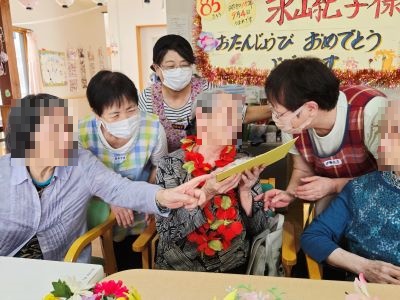 A様が85歳になられました。お誕生当日には、海外在住の長女様ご家族が駆け付け、A様の高校時代からの親友も加わって弘前迄出かけて楽しい時間を過ごされました。こでまりユニットでは、今日、お誕生会を開催しお祝いしました。県外在住の次男様ご夫妻から美味しいお菓子が届きA様は「嬉しくて涙出るじゃあ」と大喜びでした。職員からは写真とメッセージ入りの色紙とハンドタオル、手作りのバースディケーキがプレゼントされ、笑顔が溢れた楽しい一日になりました。