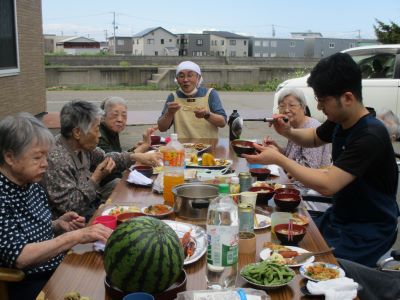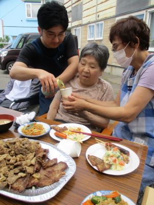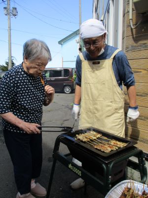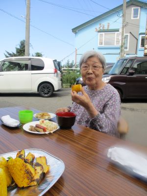 今年のBBQもお天気が良くて皆様外で食べる事が出来ました。中で準備する人、外で焼く人、それぞれが出来る事で役割を持って、仲間と外で食べる特別感を味わっています。「美味しいよ~OKです!」と味見をしながら焼き鳥を焼いて下さる方もいます。ノンアルですが、ビールも飲んで良い気分。お肉より「やっぱり嶽キミは甘くておいしいわ」と大人気でした。