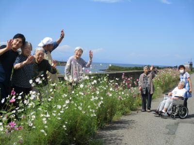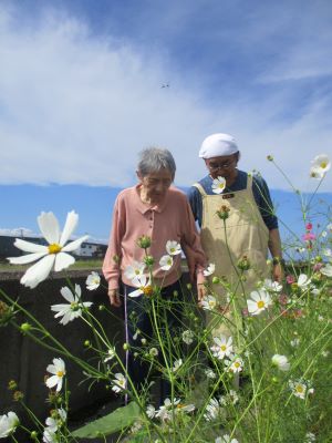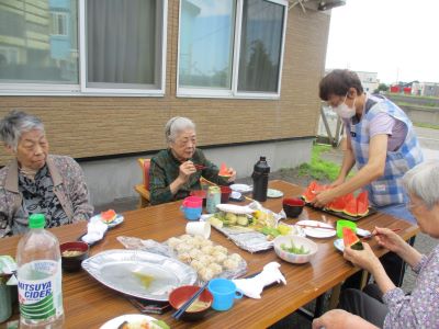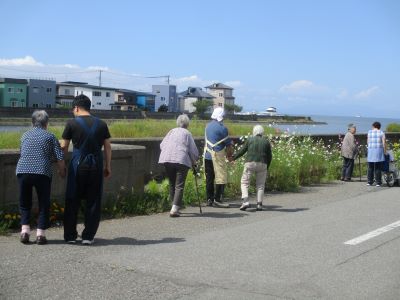 毎年恒例となっているBBQの後は散歩です。今年もコスモスが綺麗に咲いて皆様を迎えてくれます。お腹一杯で歩くので皆様ゆっくりと、視界に入る景色を見て懐かしむ人や、海の向こうの話をする人もいて、気持ちのいい散歩でした。散歩の後はデザートのスイカで水分補給。秋田のスイカは甘くて美味しかったですね。