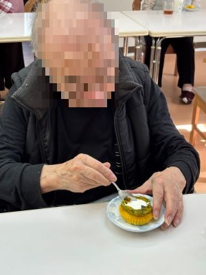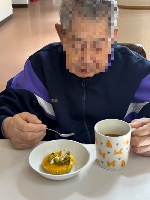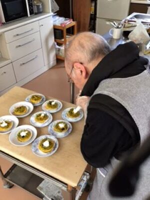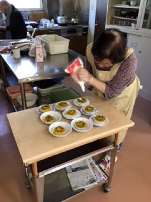 宮田館の中庭で育てていた南瓜が収穫時期となり、皆さんで収穫しました。この収穫したかぼちゃで何を作ろうかと考えていると浮かんだのが、かぼちゃケーキ。皆さんで手際よく作りました。自分で作ったスイーツに舌鼓。美味しくできました。