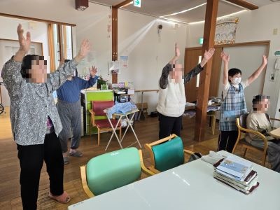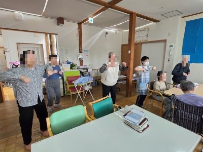 入居者様方は、テレビに『NHKみんなで体操』が放映されると誰に言われるでも無く、「スクっ」と立ち上がり画面に合わせて体操を始めます。皆様とてもお元気で力強く取り組んでおられます。キリっとした表情がとても素敵です。
