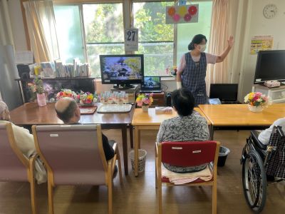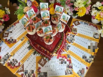 敬老の日は過ぎてしまいましたが、入居者様方を敬愛し長寿を祝うため敬老会を開催しました。感謝の言葉と写真入りの表彰状と職員手作りの紅白ゼリーのプレゼントを皆様とても喜んで下さいました。紅白ゼリーはミルクゼリーに甘いスイカを添え、アクセントに中庭のミントを飾りました。