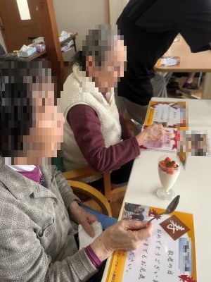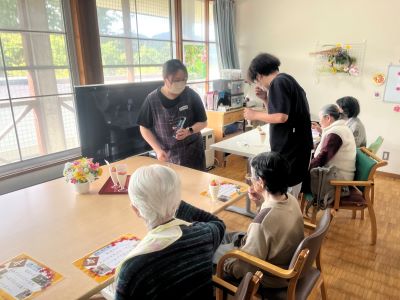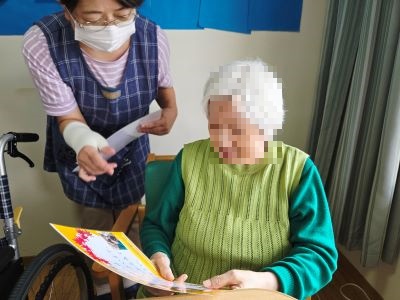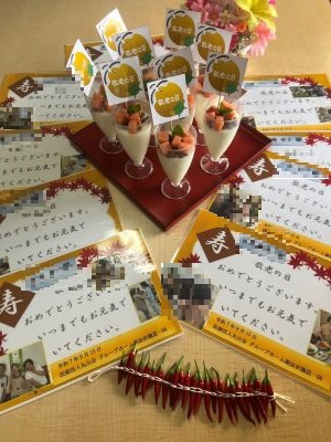 皆様の長寿を祝い、日頃の感謝の気持ちをこめて敬老会を開催しました。職員からのプレゼント、お祝いの言葉と感謝の言葉、写真入りの表彰状、手作り紅白ゼリーをお送りすると、皆様とても喜んで下さり、笑顔がたくさん見られた一日でした。