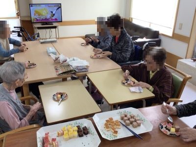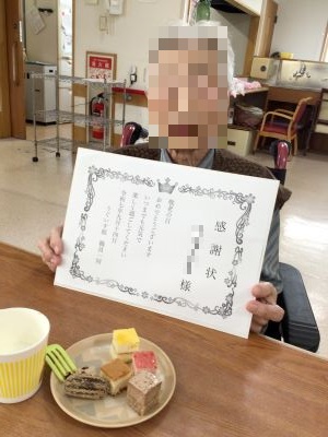9月15日は敬老の日。入所されている皆さんへお祝いという事で、栄養士さん協力の元ケーキバイキングを行いました。感謝状を手渡すと「こんな立派な賞状をありがとうございます」と喜んでくださいました。またケーキバイキングでは珍しいケーキに喜ばれ、皆様全種類のケーキを選び召し上がっておられました。「おいしいものが食べられてよかった。」と満足されていました。