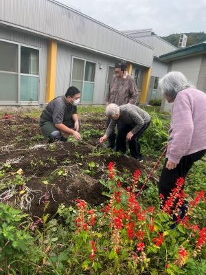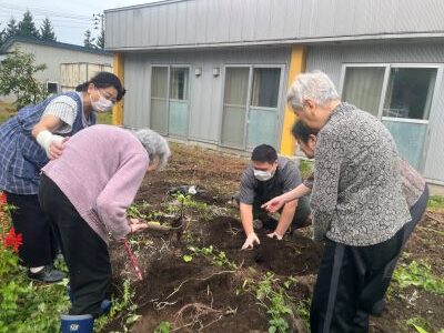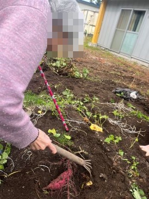 5月にサツマイモの苗植えをしました。猛暑の中、土の渇きを確認しながら夕方の涼しい時間帯に一生懸命水やりして育てました。女性入居者様方は目を輝かせて野菜作りベテラン職員の説明を聞き、A様は、「私の実家は農家なの。まかせてちょうだい」と左手に杖を持ちながらサツマイモを掘っていました。土の中からサツマイモが顔をのぞかせると、皆様、歓声を上げて賑やかな楽しいひと時を過ごしていました。