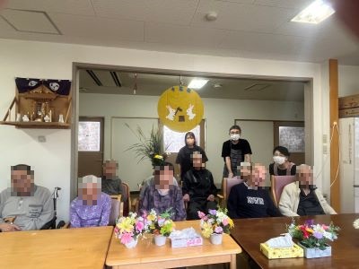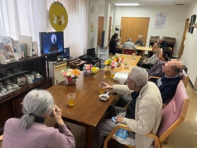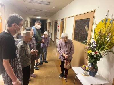 今日は中秋の名月です。こぎくユニットでは、朝から『うさぎうさぎ』『十五夜お月さん』を流し雰囲気づくりをしてススキや季節のお花、果物、お月見饅頭をお供えしました。今日の3時のおやつは、さいの目切りした畑で収穫したサツマイモと白玉でのお汁粉、緑茶を召し上がって頂きました。女性入居者様方は、1年のなかで一番きれいなまん丸なお月様が見える日と言うことで朝から楽しみにされていましたが、残念ながら夕方から空一面雲で覆われ、まん丸お月様を見ることが出来ませんでした。本物のお月様だけがお月様ではありません。こぎくにも大きなお月様があります。手作りまん丸お月様にお供えし皆で収穫に感謝しました。