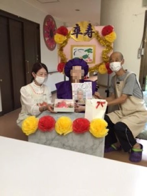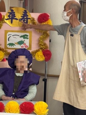 今月で90歳になられる方の卒寿のお祝いをしました。職員からは、お祝いの言葉とプレゼントをお送りしました。また、管理者より「目出度い」と言う事で、【鯛】のお菓子が送られると「ありがとう。これからも宜しくお願いします。」と皆様にお礼挨拶がありました。いつまでもお元気でいて下さい。