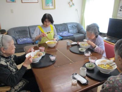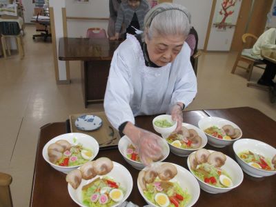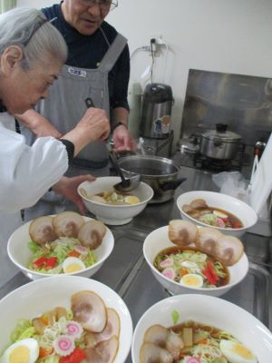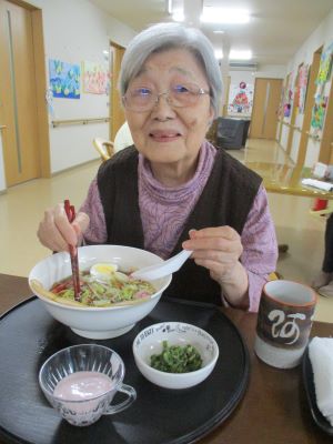 「寒くなってきたね。」と今朝は暖房をつけました。「こんな日はラーメン屋さんにお客さんが多いかも。」「酸ケ湯に雪が積もったもの。」と話していたら、今日の昼食はラーメン!朝から茹で卵を作っていたので玉子サンド用かな?と思っていた皆様。何と、ラーメンに載っています!チャーシューも野菜もたくさん載っていて、普段ラーメンには入っていない【カニカマ】もあります。「おいいしい。」「スープが美味い!」「店に行くよりおいしい。」と“ご馳走さま”まで“美味しい”しか聞こえませんでした。