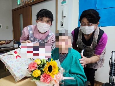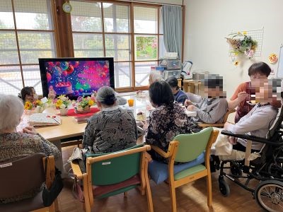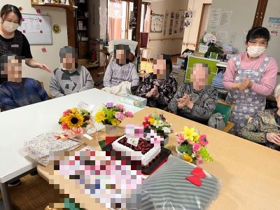 今月はA様が93歳、B様が88歳になられました。A様のお誕生当日、長女様が駆けつけ素敵な色合いのカーディガンがプレゼントされ、県外在住の長男様ご夫妻から美しいフラワーアレンジメントが届けられました。B様のお誕生日当日には長女様がB様が大好きな緑色の衣類とお菓子のプレゼントを持って駆けつけて下さいました。こでまりユニットでは、今日、お二人合同でのお誕生会を開催しお祝いしました。職員からは写真とメッセージ入りの色紙。そして、手作りのバースディケーキがプレゼントされました。皆様、歌い、笑い、美味しいケーキに舌鼓を打ち、楽しい一日を過ごしていただきました。