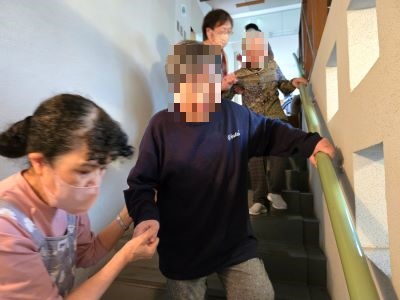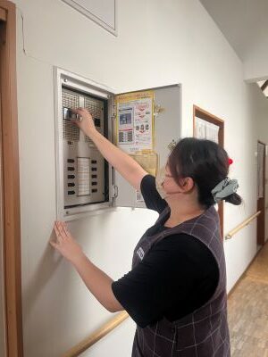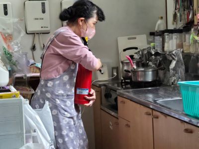 日中、2階こでまりユニット台所コンロ周辺からの火災発生を想定して、初期消火訓練、119番通報訓練、入居者様方も参加しての誘導、避難訓練を行いました。入居者様9名中、車椅子使用の方が2名、自力歩行の方が7名おられます。限られた介護職員による入居者様方のスムーズな避難のために、避難経路と介助方法について話し合いを重ねて実施しました。日々火事にならない様に細心の注意を払い、万が一、火災が発生しても被害を最小限にとどめ、入居者様と職員の安全確保に努めて参ります。併せて地震発生時の訓練も行いました。