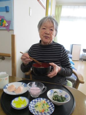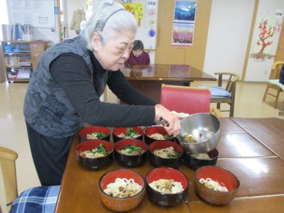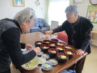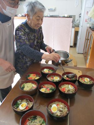 今日のお昼は温かいうどんを作って皆さんでいただきました。「やっぱりおいしいよー。」と笑顔が溢れます。昨日茹でたじゃが芋が残ったので、サラダも作りました。手際が良くて、あっという間に美味しいサラダの出来上がりです。新じゃがサラダはホクホクで甘く、皆様“お代わり”もしています。食べながら、次は何を作ろうかと笑顔で話していました。