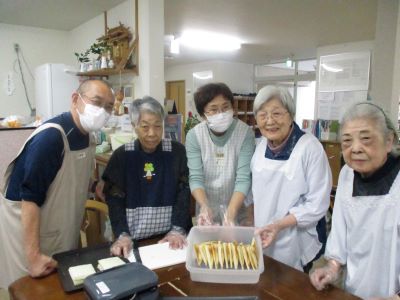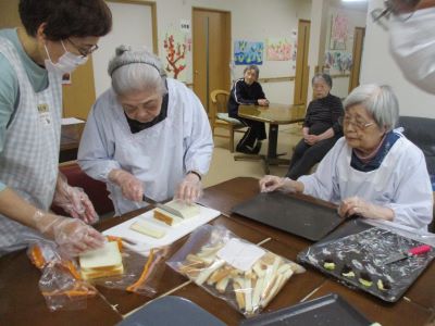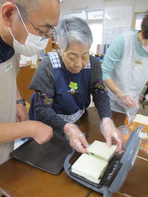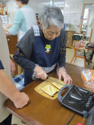 リクエストの多いホットサンド。作業を手分けして作りました。乗せているのは一番人気のバターとあんこのようです。パンの焼けるいい匂いがして皆様が集まってきました。餃子が入っていたり、厚焼き卵やチーズ等もあってワクワクしながらのおやつの時間です。切り落としたパンの耳は明日の朝、黒糖をまぶした揚げパンです。今から楽しみだそうです。