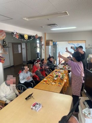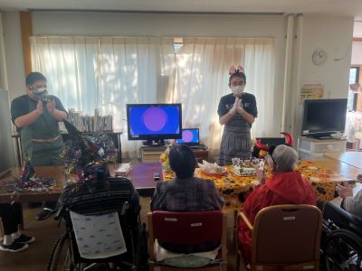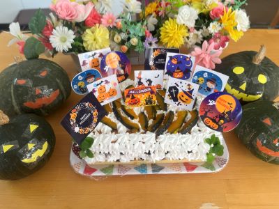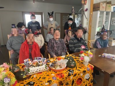 こぎくユニットでは、今日、一日早いハロウィンパーティを行いました。職員は、入居者様方に喜んでいただけるようにハロウィンの曲を流して飾り付けし、中庭で穫れたカボチャを使ってケーキを作り、カボチャを可愛らしく変身させたりと何日も前から準備に勤しんできました。入居者様方は、お互いの仮装した姿に大笑いし、賑やかで愉快な時間を過ごしておられました。