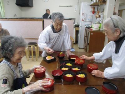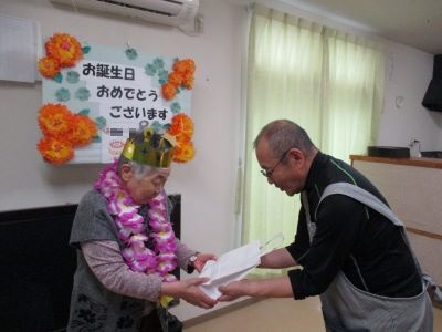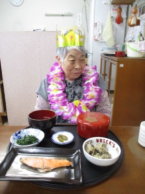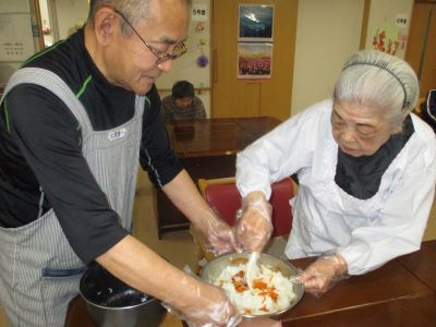 今日は誕生日の方がいます。お祝いに「ケーキも食べたいけど寿司も食べたい」と仰っています。皆さんで作り始めると、誕生日の方もお手伝いをしてくれました。無事にお昼ご飯に間に合って、皆様でお祝いをしました。「初めてだ、私のために嬉しいよ。涙出る」と感動され、お礼の言葉を皆様に伝えていました。