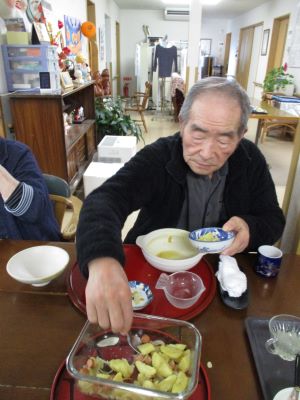 カレーと聞いて新じゃがをたくさん用意。でも「海鮮だから少しあればいいよ」との事で、じゃが芋はジャーマンポテトになりました。美味しくて皆様お代わりをしてくれました。作った方が「自画自賛だけど、皆さんで食べると本当に美味しいわ」と大満足。デザートはラ・セラで買ってきたリンゴの『きんせい』。皮を剥いて下さって皆様で美味しくいただきました。『きんせい』を食べながら「また買い物に行きたいわね」と話していましたので、また行きましょう。