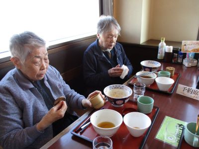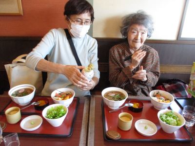 “和風レストラン まるまつ”に行ってきました。前の日から何を食べようかとあれこれ考えていましたが、メニュー表を見たら迷うばかりです。カツ丼、栗ご飯、天丼、サーモン丼、鶏そば丼と自分達で選んでいます。注文したものが届くまで女子トークが始まり、笑いが止まらない楽しい待ち時間でした。皆様いつものようにペロリと完食され、「また来たい」「おしゃべりが楽しかった」「帰ったら寝るか」など、はくちょう荘に着くまで楽しい時間が途切れませんでした。