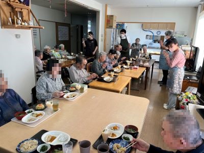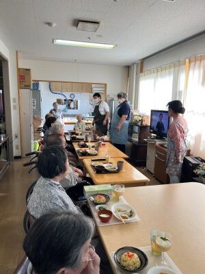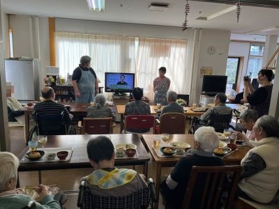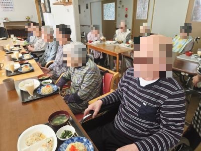 今日は、毎月恒例のこぎく、こでまりの2ユニット合同での昼食会です。食事の前に誤嚥や誤嚥性肺炎予防のために嚥下体操を行いました。ゆっくり深呼吸から始まって、首、肩の運動、口、舌、喉の運動を行いました。皆様、パ・タ・カ・ラと元気に発声しておられました。最後に職員の両手を合わせて「いただきます」の声がけで楽しい食事会がはじまりました。