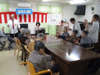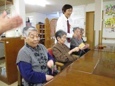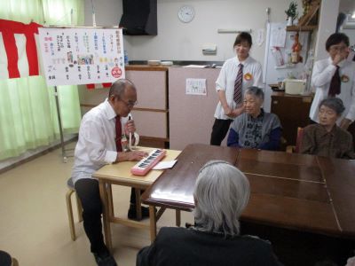 童謡が演奏されると懐かしそうに小さな声で歌っています。歌謡曲が演奏されると手拍子をして「ズン ズン ズン ズンドコ~」「私のだいじなだんな様~」とコブシを効かせて気持ちよさそうに歌います。「この歌が流行った時には…」とそのころを回想して仲間と会話が弾んでいます。コンサートの後は歌と茶会です。茶会のお菓子は、きんつばと死ぬまで長生きできるというカステラで、皆さん大笑いしていました。