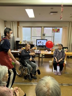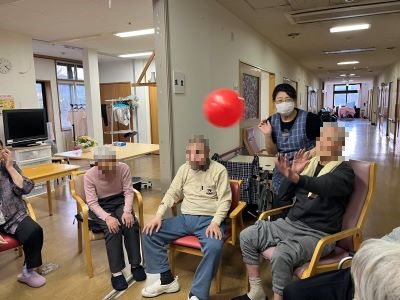 入居者様方に、安全に楽しめて、身体機能の維持や認知能力の向上、コミュニケーションの促進に効果的な風船バレーで気持ちのいい汗をかいていただきました。入居者様方も職員も大笑いし、声を掛け合い、気がつくと皆様、額にうっすらと汗をかいていました。