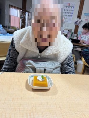 今日から12月。いよいよ冬本番、寒さが本格化してきました。こぎく、こでまりユニットの今日のおやつはあまい、あまーい柿ゼリーです。関連法人施設内に実った渋柿を、給食を作っている関連別会社の職員が渋抜きをして美味しいゼリーを作りお裾分けして下さいました。ゼリーにホイップクリームを飾り、ワンポイントに中庭のミントを添えてみました。外は寒いですが、入居者様方は甘い甘い柿ゼリーを召しあがり、笑顔満開で心もポカポカになりました。