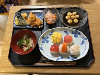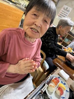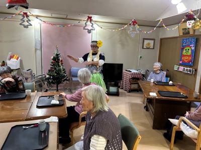 星遊荘忘年会を開催致しました。忘年会と言えば「出し物」。職員のフラダンスでは、鮮やかな腰の振りに、皆さん拍手喝采!忘年会メニューは、てまり寿司・エビのかき揚げ・紅白なます・豆腐白玉黒蜜かけを食べました。来年もよろしくお願いいたします。