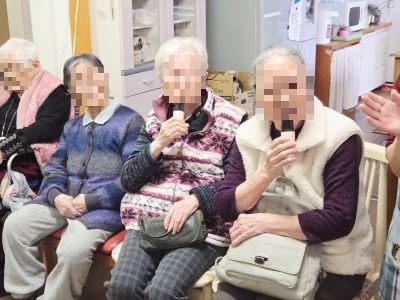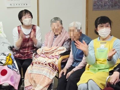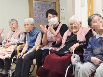 今月も、感染症予防対策(換気、手指、マイクの消毒)をしながら入居者様方に楽しく元気に歌っていただきました。『青い山脈』『アメイジング・グレイス』『ブルーライトヨコハマ』『せんせい』『有楽町で逢いましょう』『東京のバスガール』『リンゴの唄』等を選び、皆様、楽しそうに歌い親睦を深めておられました。