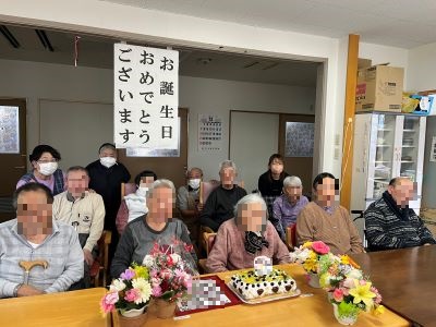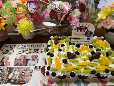 今月はA様が86歳になられたので、長男様がお祝いに駆け付けて、きれいなお花をプレゼントしてくださいました。職員からは、写真とメッセージ入りの色紙と、手作りケーキをプレゼントしました。ケーキには、ビタミンCがたっぷりな「キウイ」をふんだんに使いました。職員が「ビタミンCには、老化や病気を防ぎ免疫力を高め美肌効果もある」とお伝えすると、A様が、「じゃあたくさん食べなきゃ」と両手で頬を抑えたので皆様大笑いしました。たくさん食べなくても美肌なA様が羨ましい職員でした。