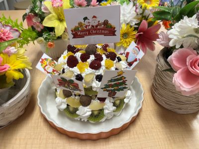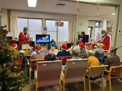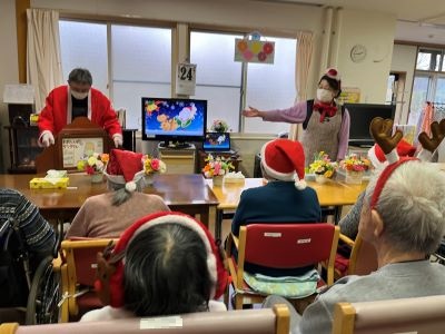 今日、こぎくユニットでは、クリスマス会を開催しました。クリスマスソング、『ジングルベル』『サンタがまちにやってくる』『あかはなのトナカイ』『きよしこのよる』『ひいらぎかざろう』『あわてんぼうのサンタクロース』等を全員で歌いました。次に職員2名による紙芝居『わすれんぼうのサンタさん』で大笑いしていただき、最後に、職員手作りのクリスマスケーキでのお茶会でゆったり、のんびりした楽しい時間を過ごして頂きました。